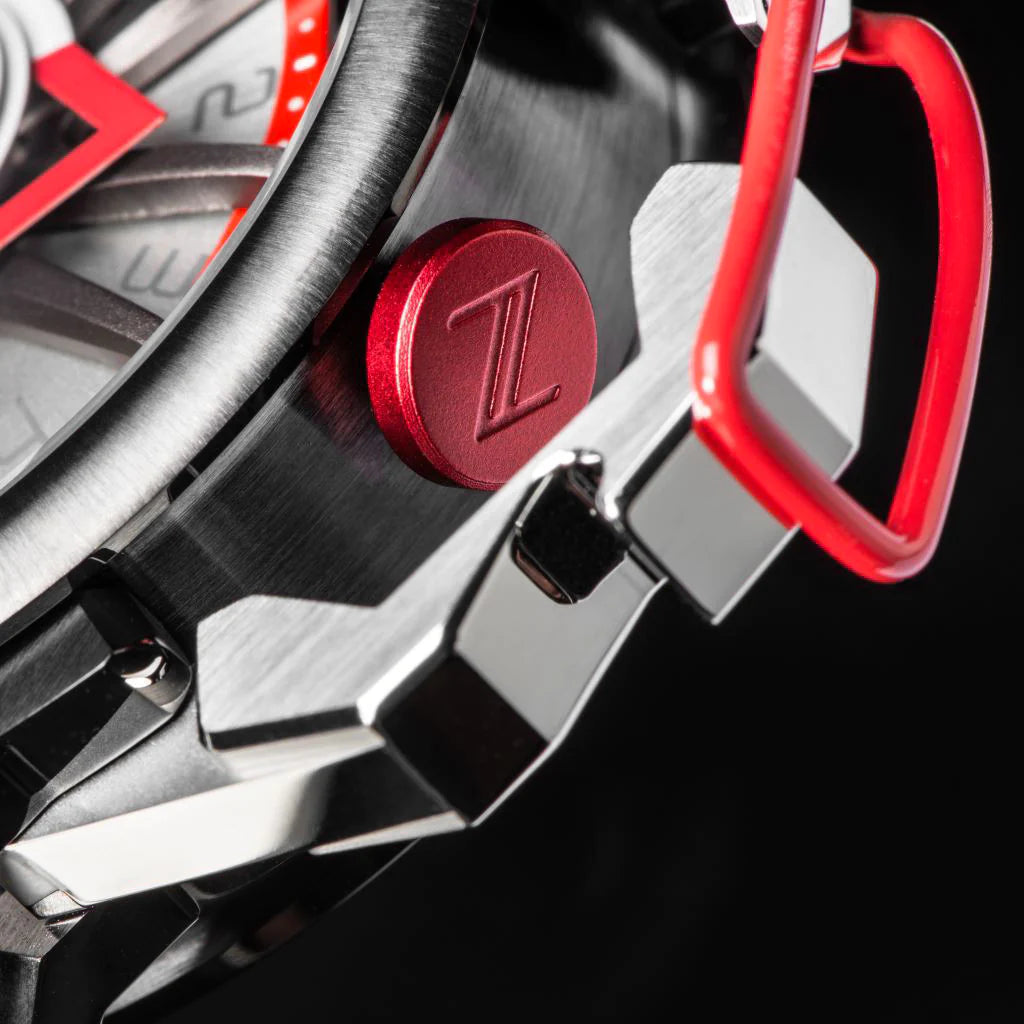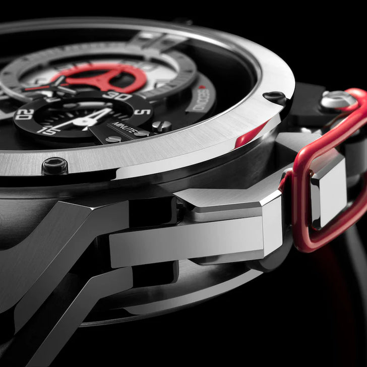 Each Mazzucato RIM watch is closed by a clasp that fixes the watch to show the face you prefer for the occasion. Open the clasp and reverse your watch to swap between time and chronograph.